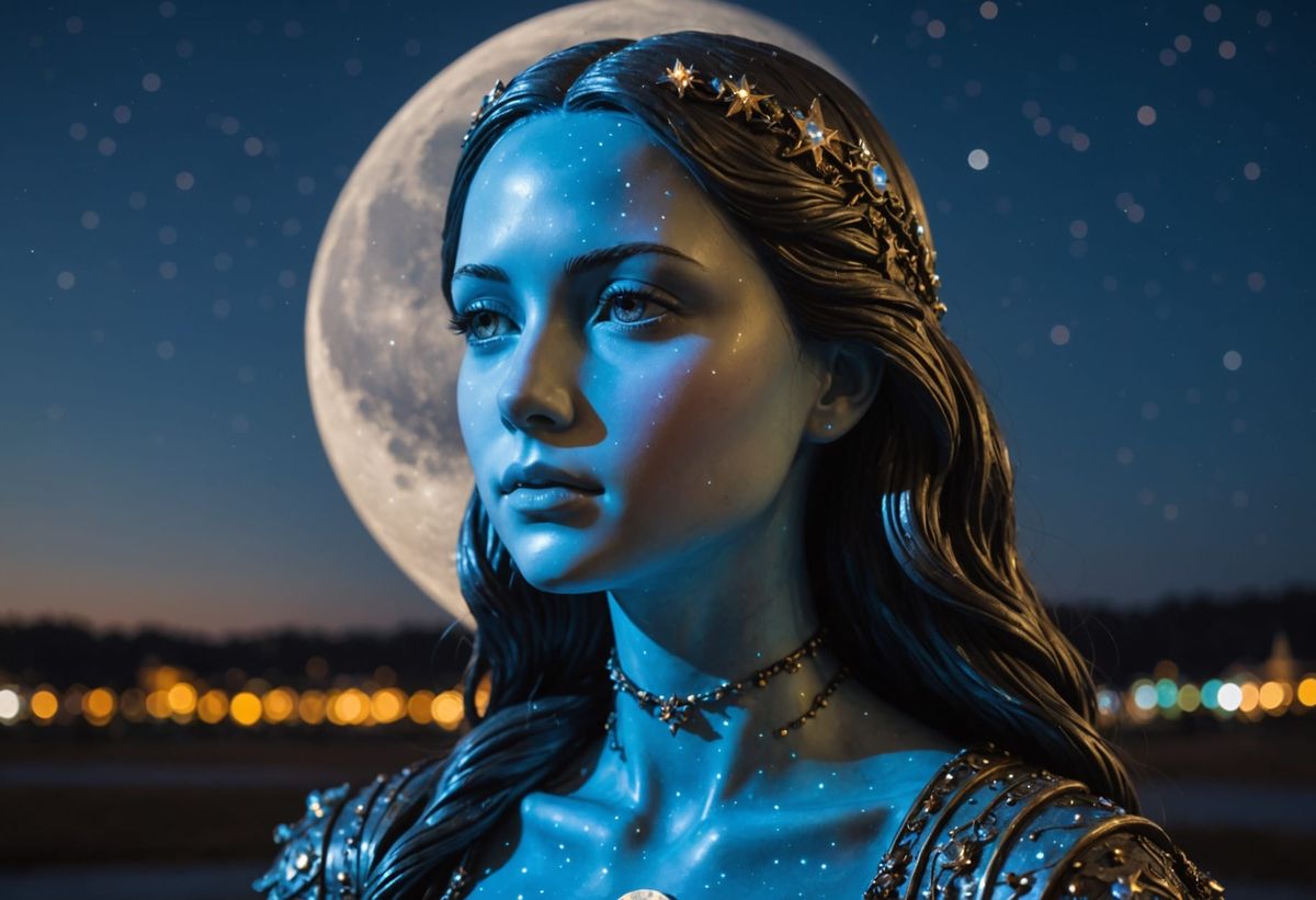 This image shows a close-up of a moonstone sculpture depicting a girl-moon. The sculpture is set against a backdrop of a starry sky, illuminated by magical lights. The overall effect is ethereal.