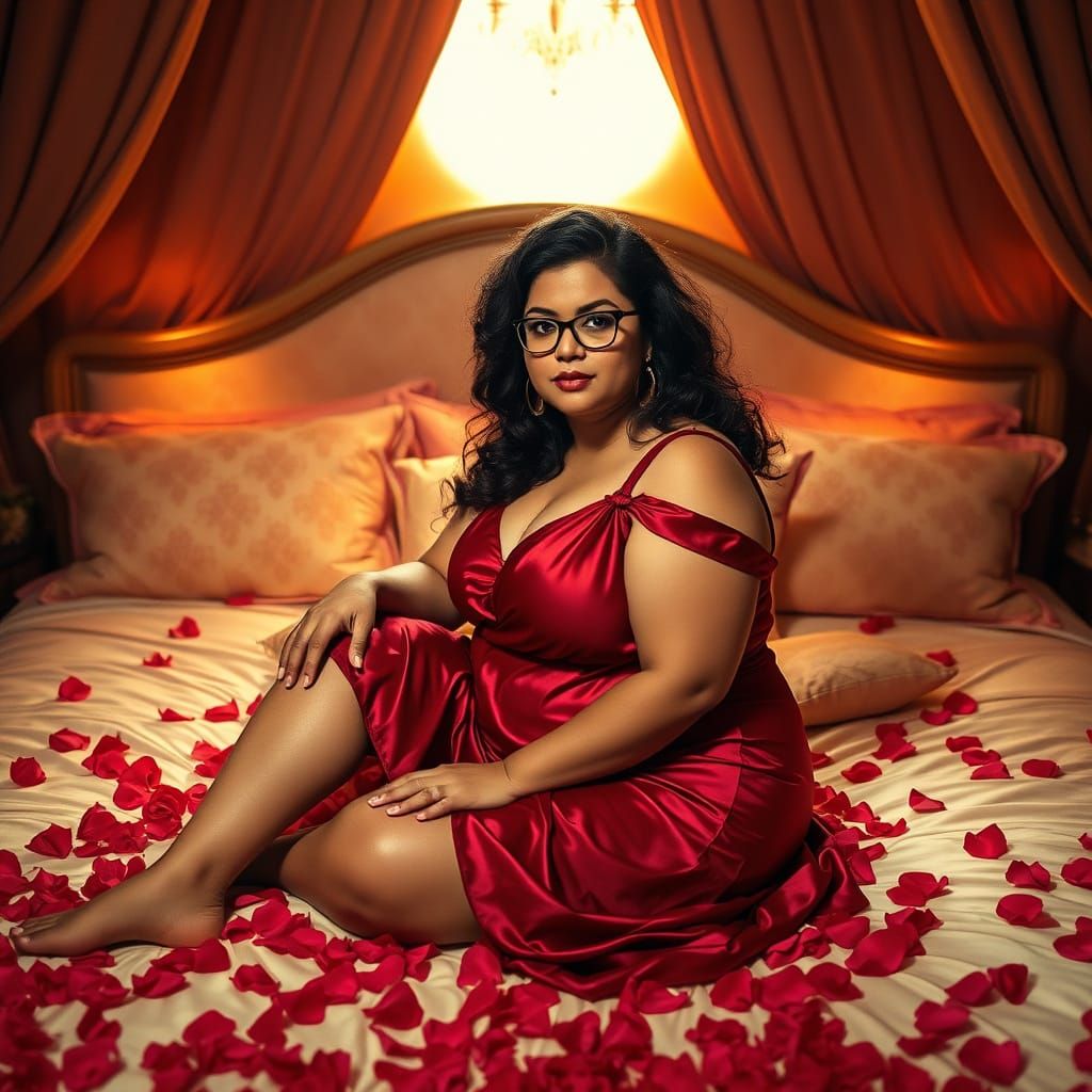 A sensual image of an Indian woman on a bed of silk and roses. Golden light and candlelight create a romantic atmosphere, with art nouveau and fantasy influences.