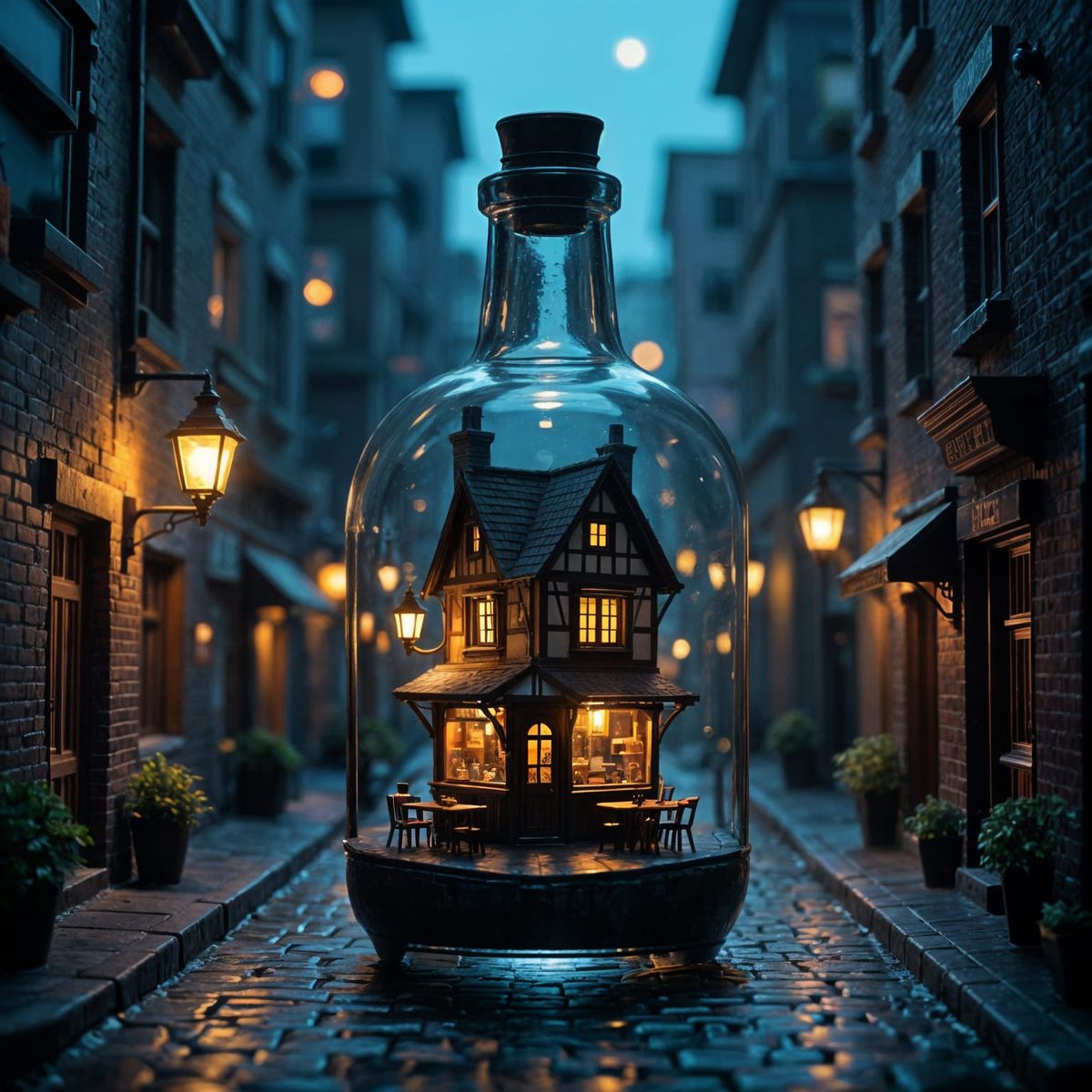 An AI-generated image of a tiny tavern glowing within a glass bottle, surrounded by impossible, spiraling city alleyways and streetlights resembling stars.