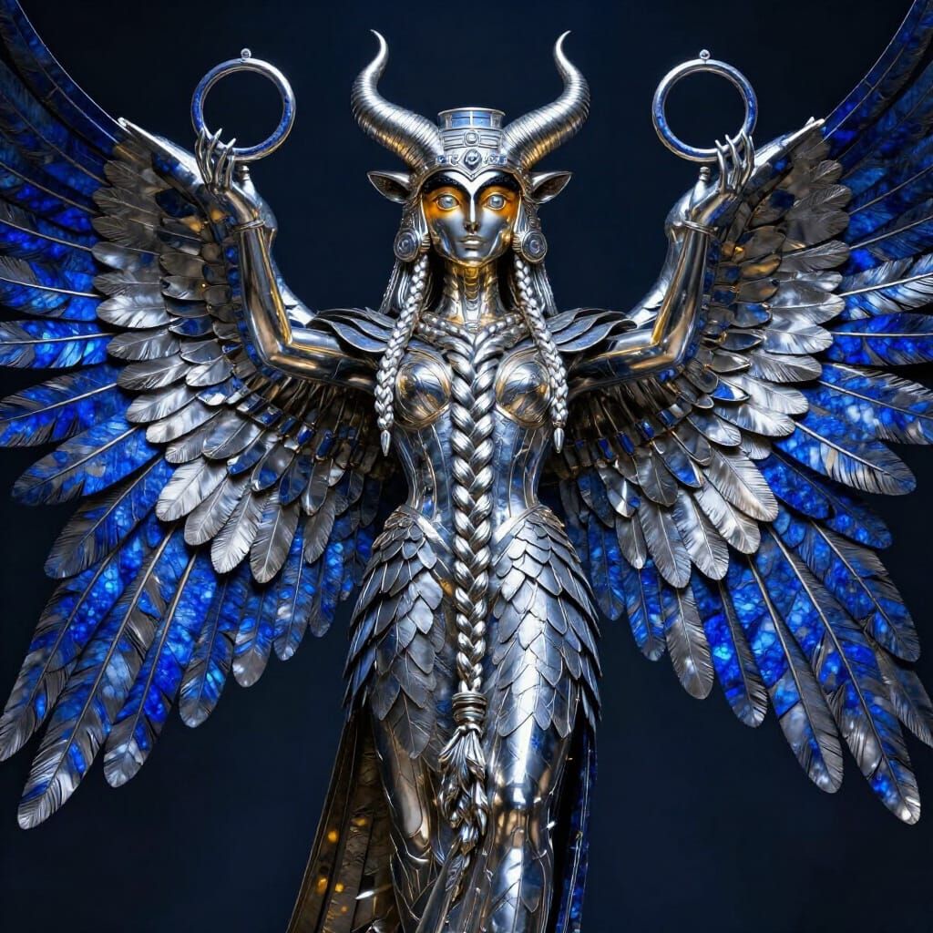 This image depicts Kilili, a powerful feminine entity. She is rendered in high-polish silver and lapis lazuli, radiating electrum light with a ceremonial pose and horned tiara.