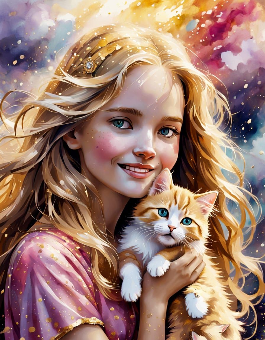 This delicate, Impressionist-style watercolour portrait features a happy young girl with golden hair and a pink dress, surrounded by a whimsical storm of colourful spatters. The intricate, highly detailed artwork showcases soft, blended brushstrokes and a textured paper effect, with a warm golden light c...