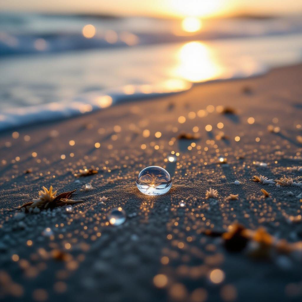 A captivating image showing morning dew drops glistening on sand. It is reminiscent of a dramatic 35mm film still, enhanced by cinematic lighting and subtle vintage aesthetics.