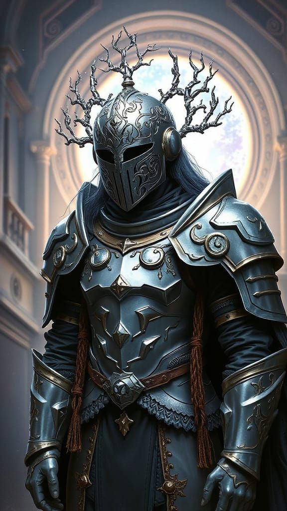 A majestic warrior in silver armor with celestial, vine-like designs. Features dramatic lighting and architectural grandeur, with a cosmic portal. Digital painting with sharp details.
