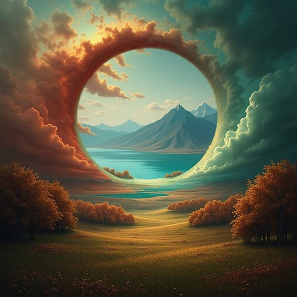 This image features a vibrant landscape with a blue sky, green fields, and golden trees under radiant sunlight. Distant mountains and a colorful lake add to the photorealistic scene.
