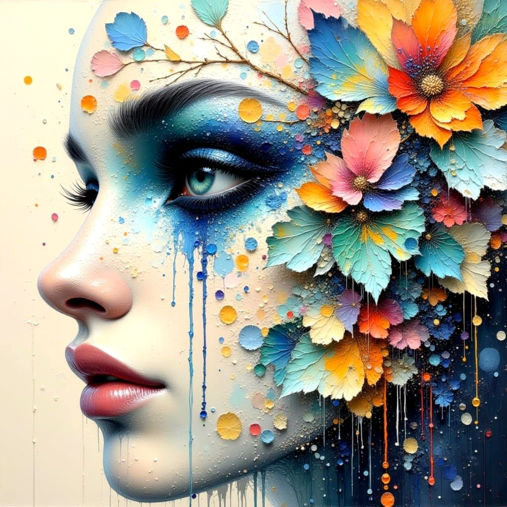 A striking portrait rendered with hard brush strokes and impasto techniques. The image features volumetric textures, craquelure effects, and a vibrant color palette, reminiscent of wet ink sketches and watercolor art.