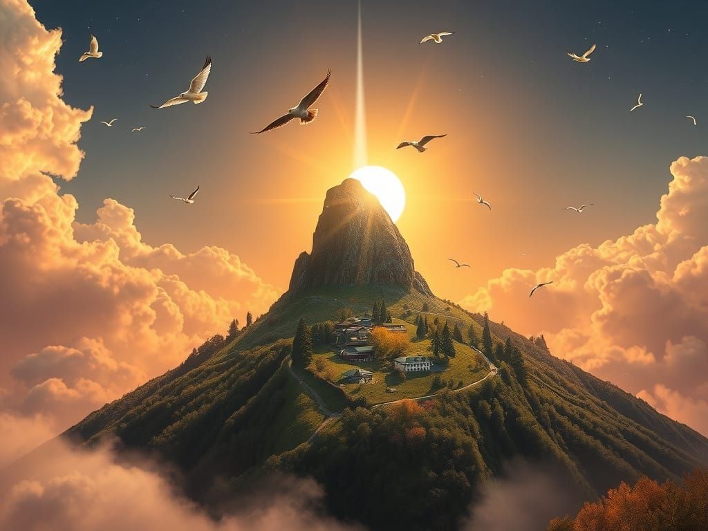Eine fliegende Insel im Himmel angetrieben durch Windkraft, auf der Insel ist ein Berg, wo Energie durch Windmühlen erzeugt wird. Die Insel umgibt eine magische leuchtende Aura. Auf der Insel ist eine Siedlung die durch den Ackerbau lebt. Ein dichter Wald umgibt die Siedlung. Vögel und Tiere leben mit ...