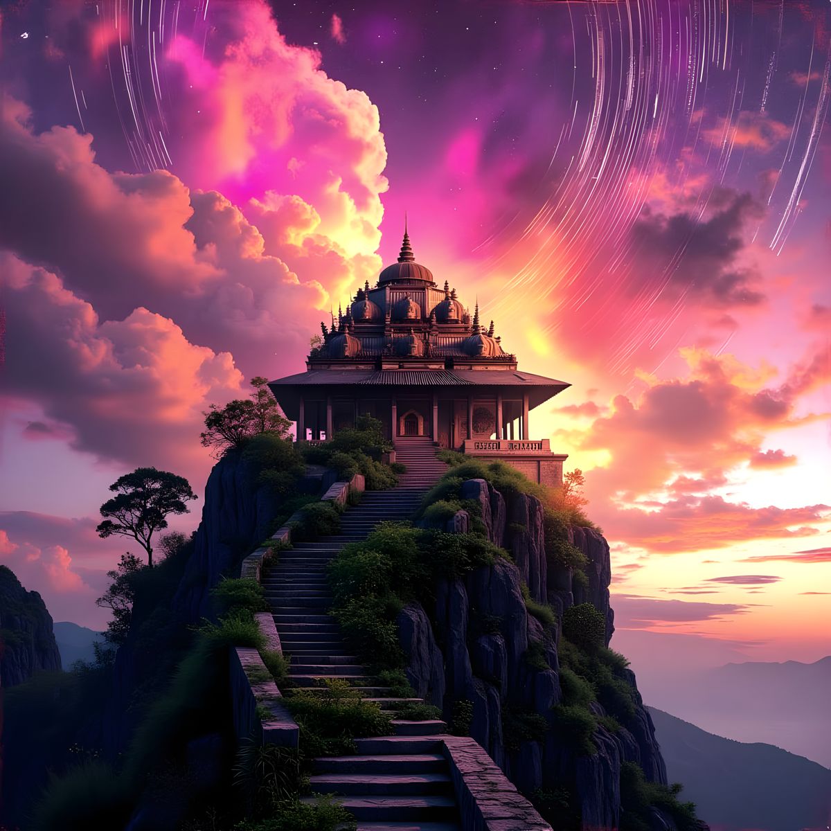 This breathtaking image captures a serene mountaintop temple bathed in the warm glow of twilight, with vibrant star trails streaking across the sky in shades of purple, pink, and gold. The lush vegetation and tranquil atmosphere evoke a sense of wonder and peace.