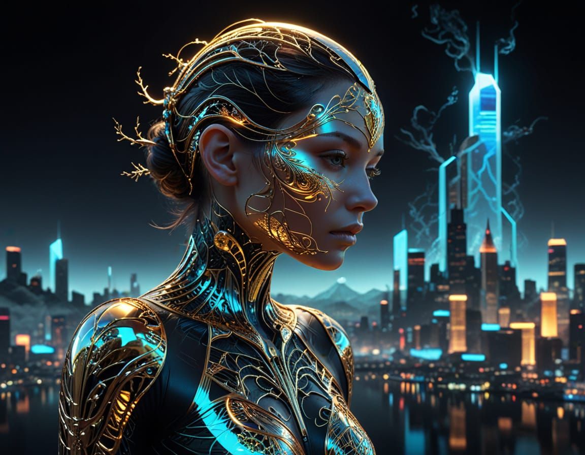 She is notโsheโs a codex, her gilded silhouette screaming the duality of humanity: neon veins bleed both life and data.