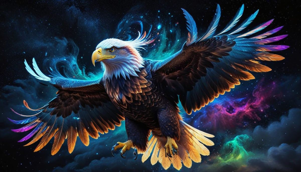 A striking picture of an eagle soaring through the night sky, its body formed of radiant light. The image is a digital artwork featuring triadic colors and cosmic energy.