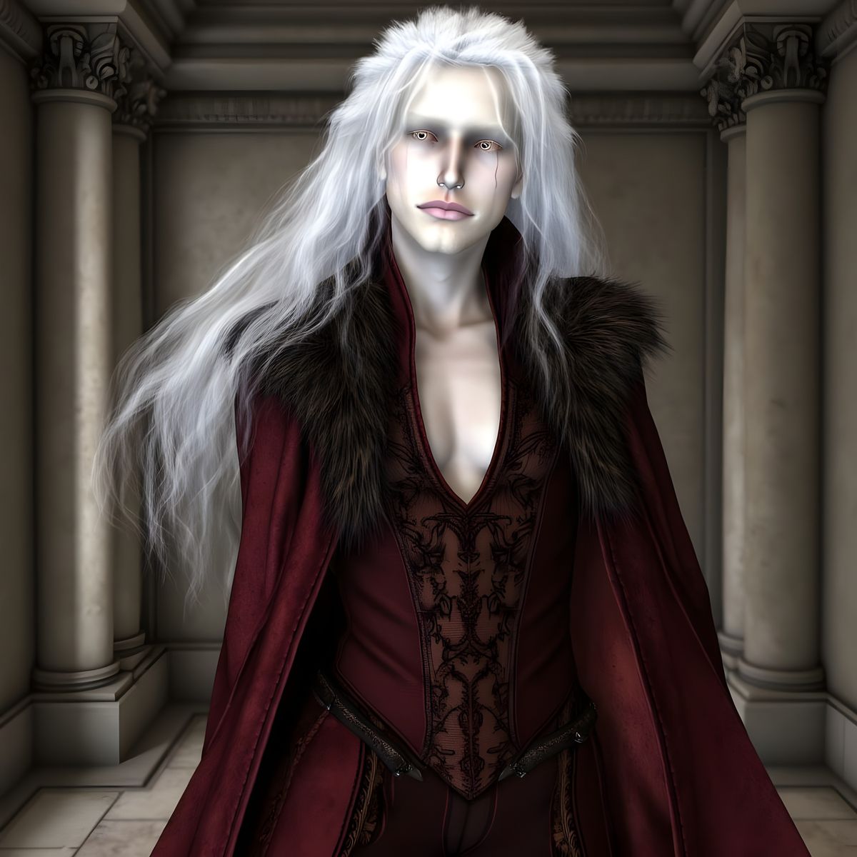 A full-body portrait of a fair Celtic prince with platinum hair and violet eyes in a castle hall. He wears a fur-trimmed red velvet cloak in a medieval fairytale style.