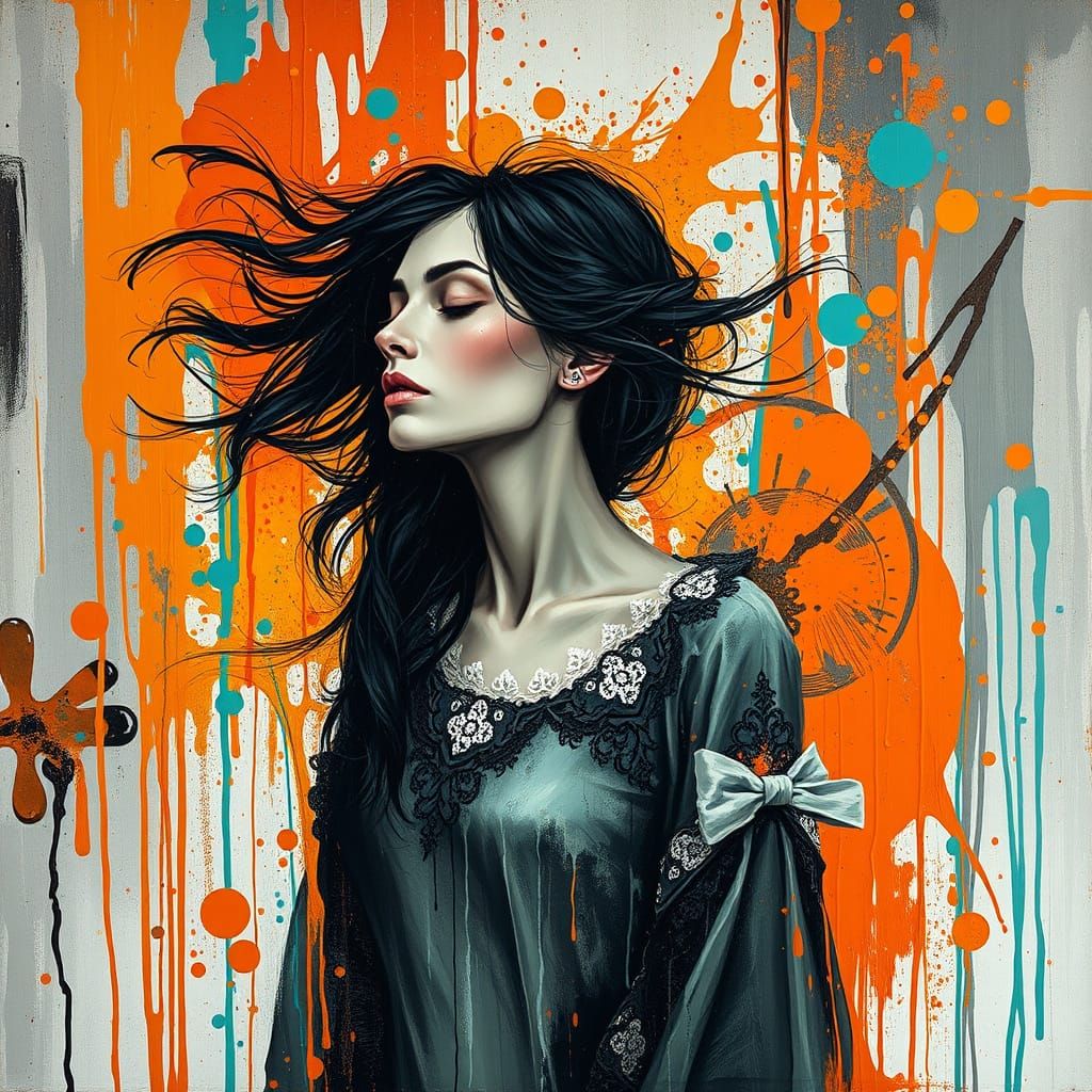 This image shows a woman with black hair and lace clothing emerging from a canvas of paint. The artwork blends traditional techniques with street art elements, using impasto and geometric shapes.