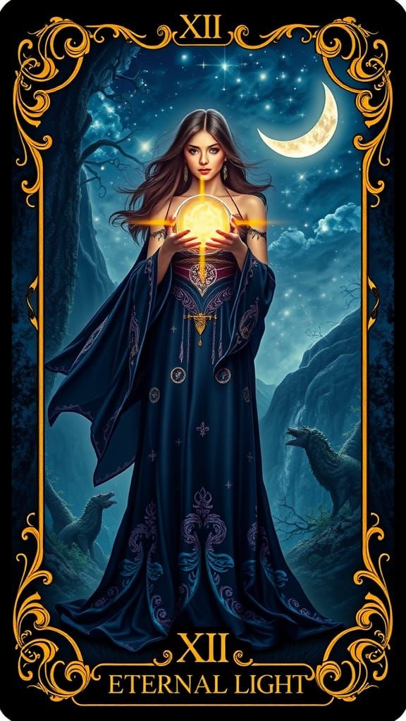 This image shows a tarot card design featuring an enchantress in a moonlit forest. She holds a golden orb, with phoenixes and dragons embroidered on her gown, set against a celestial backdrop in a mystical style.