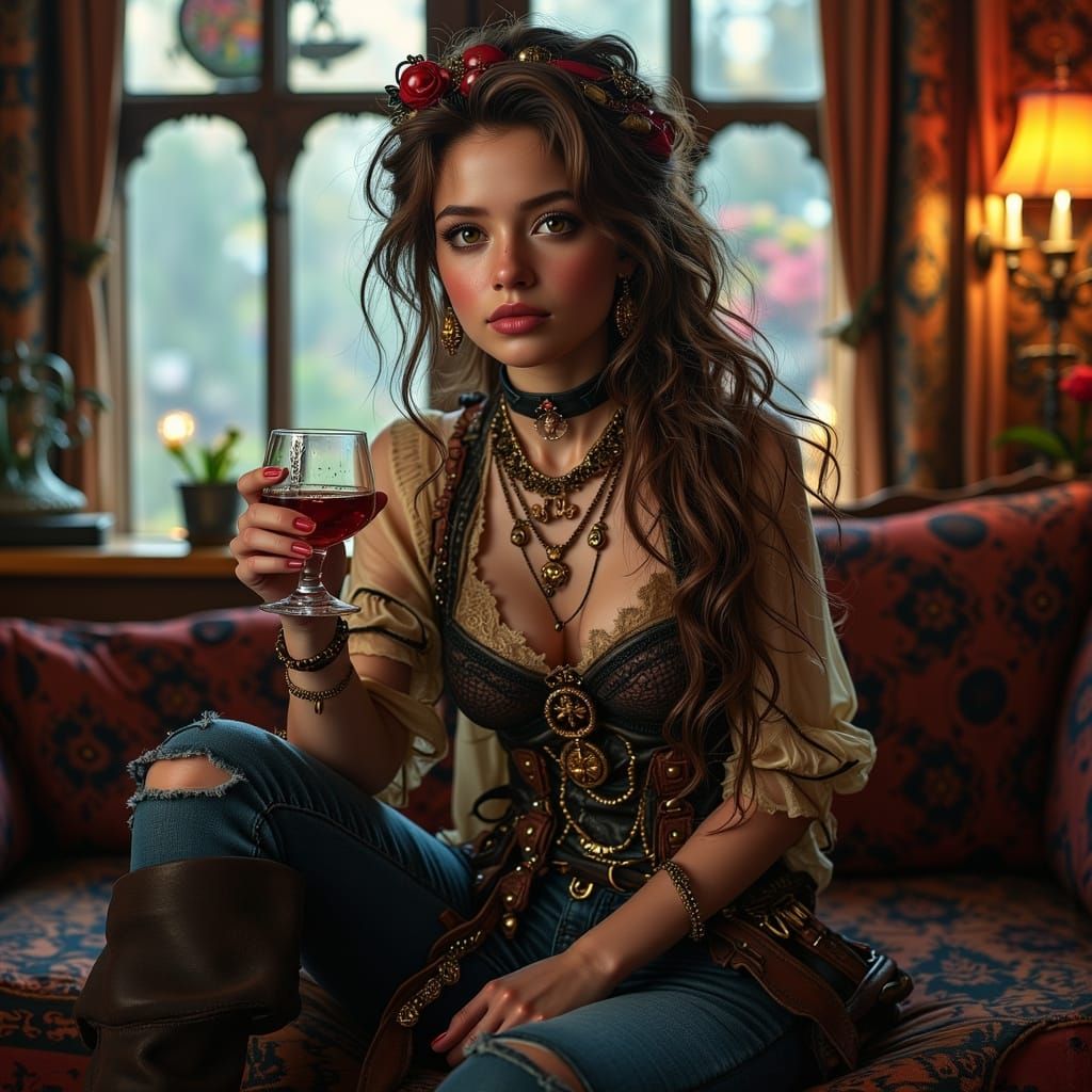 A hyperrealistic image of a female pirate captain in detailed attire, relaxing in her cabin with a drink. Features dramatic lighting and a colorful, detailed background.