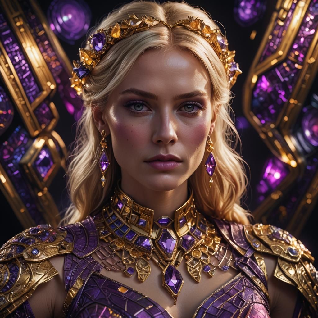 A striking picture of a blond woman in an ornate purple outfit with futuristic jewelry. This hyperrealistic digital portrait features vibrant colors, soft lighting, and high-resolution textures.