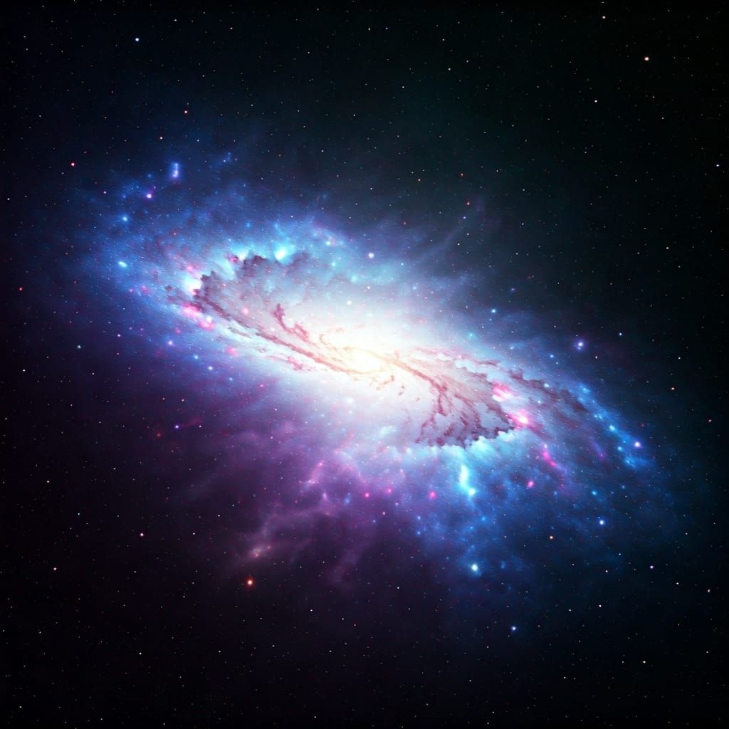 A vibrant image of a galaxy featuring purple, blue, and pink hues, speckled with bright stars. The image evokes a fantastical concept as a detailed matte painting with deep colors.