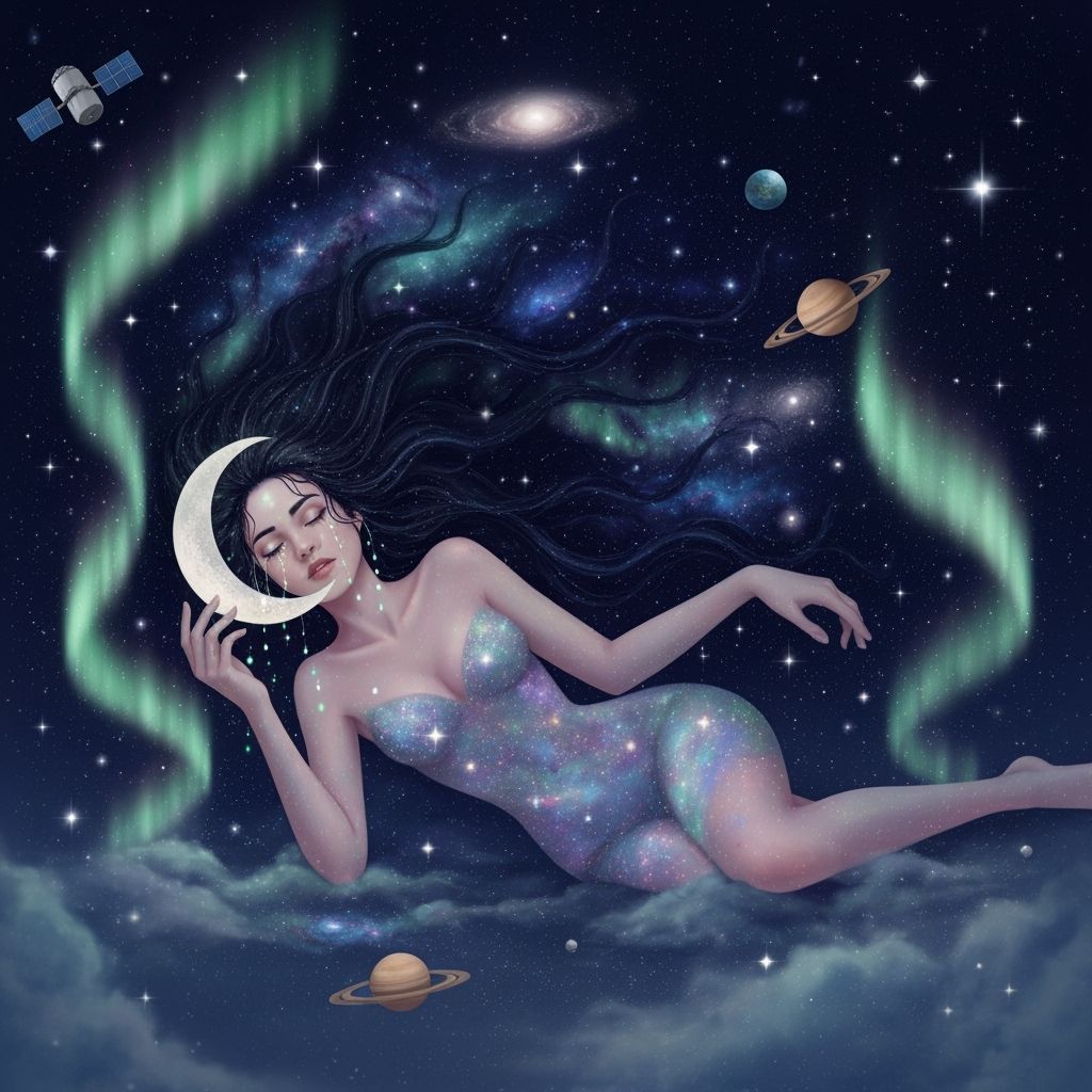 A divine female figure rests amidst stars and galaxies, her hair merging with nebulas, adorned in cosmic light. This art evokes a dreamy, celestial mood with vibrant colors.
