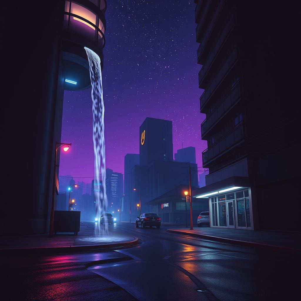This image depicts a striking scene of a deserted street at night, under a dark purple starry sky. A futuristic building's window is a source of a majestic waterfall, which pools onto the empty street below, illuminated by moody lighting in a synthwave-inspired atmosphere.