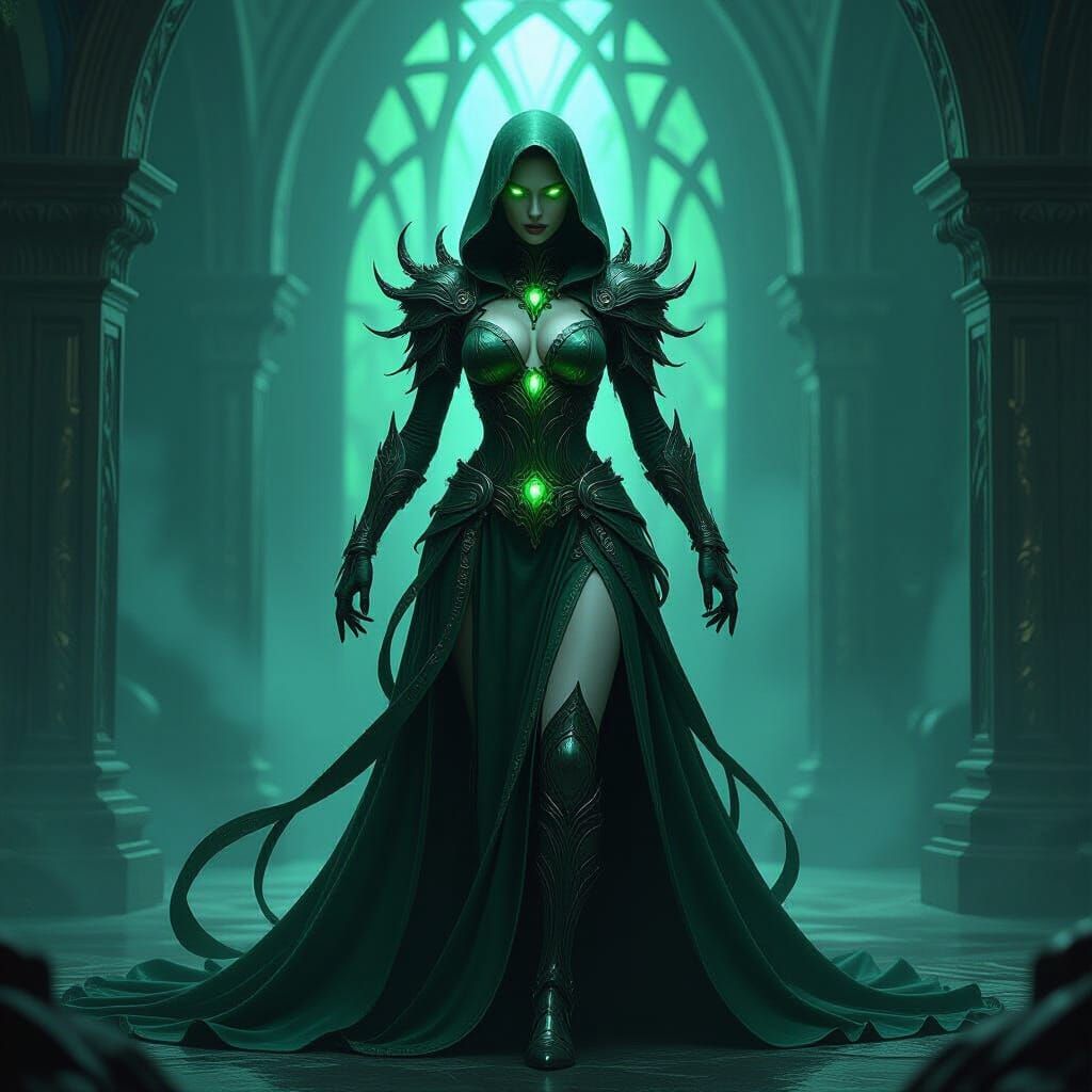 A mesmerizing sorceress stands in a crystal palace, clad in living armor of metallic vines, her emerald eyes gleaming. The image evokes dark fantasy with shifting gowns and magical energy.