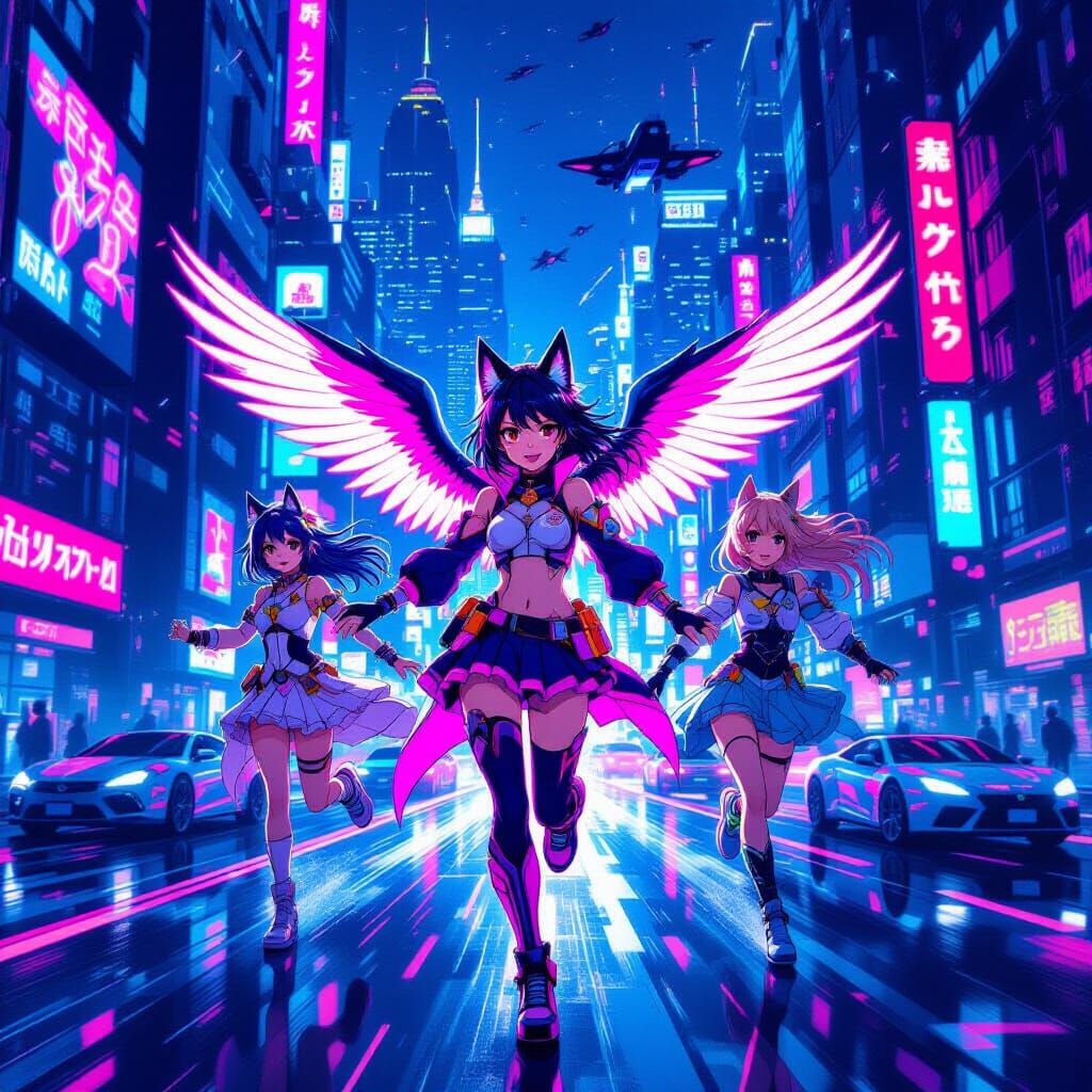 A vibrant image of anime girls dashing through a cyberpunk cityscape. The scene is alive with neon lights and towering skyscrapers, rendered with dynamic angles and bold colors in a cel-shaded style.