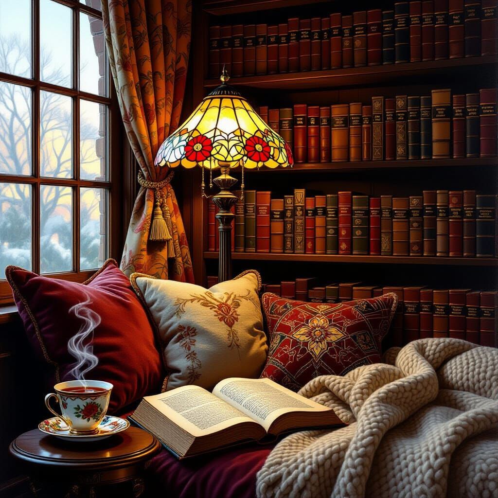 This image shows a detailed fantasy illustration of a comfortable reading nook. Warm light from a Tiffany lamp illuminates overflowing bookshelves and inviting furnishings, creating a dreamlike atmosphere.