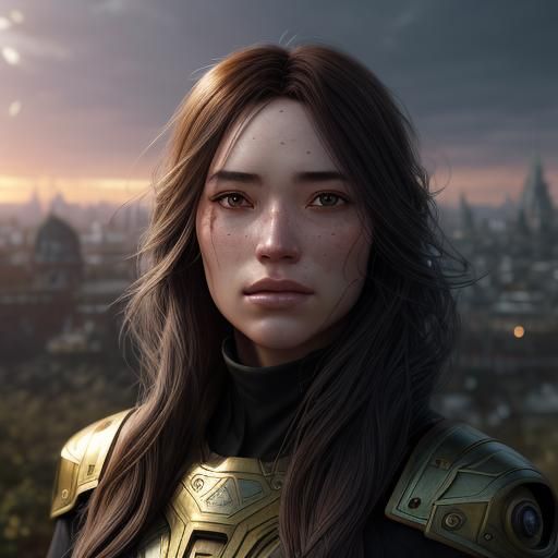 A head and shoulders portrait of a girl surrounded by swirling leaves at sunset. This hyperdetailed image features dynamic lighting and triadic colors, resembling splash art.