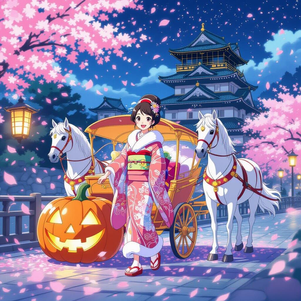 This image shows a girl in a beautiful kimono and sparkling sandals, exiting a pumpkin carriage at night. Magical light, cherry blossoms, and stars create a dreamy atmosphere, rendered in a diffused watercolor style.