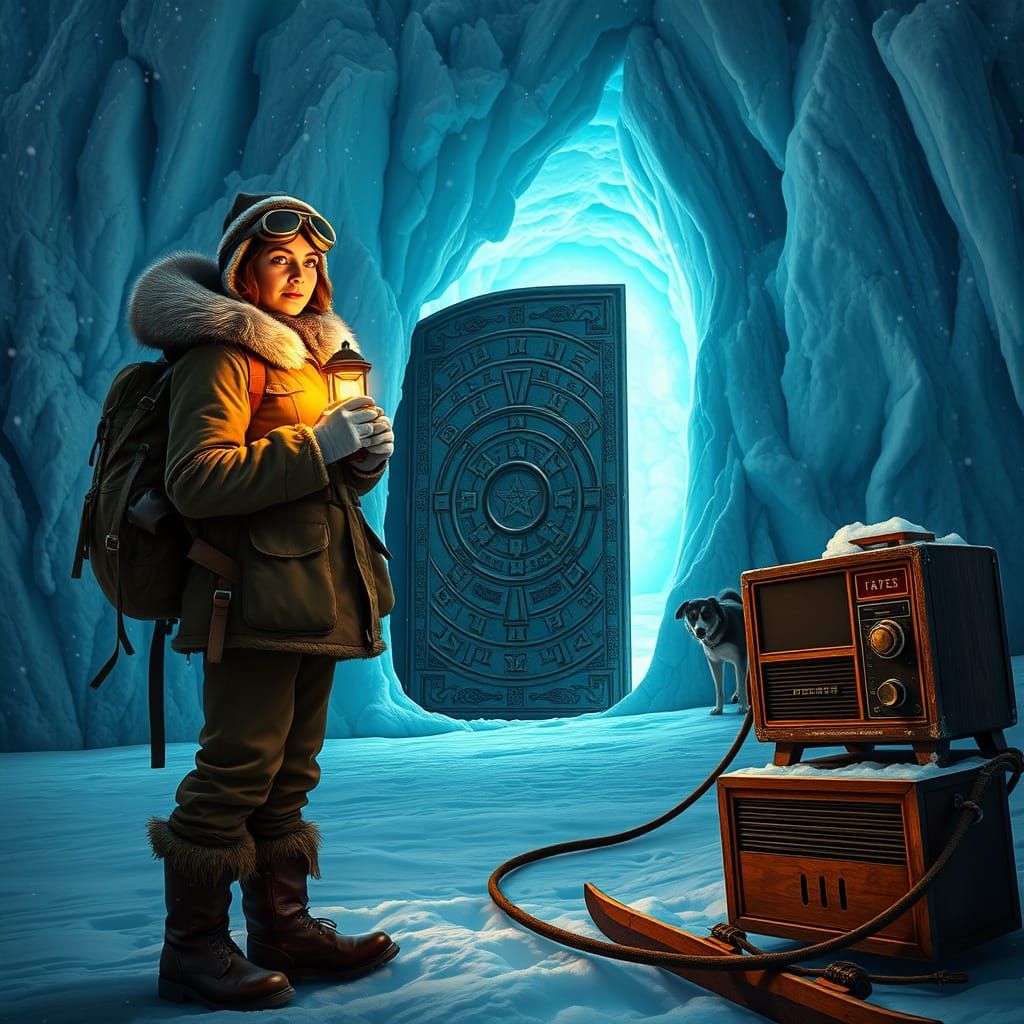 This image shows a female explorer in 1930s polar gear facing a colossal, arcane door in a blue glacier in Antarctica. Warm lantern light illuminates the scene, styled as a pulp fiction illustration.