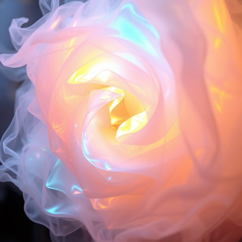 This image features a hyperrealistic, masterfully lit photo of a translucent, spiraling cloud of pastel rainbow colors. It glows with a golden hour effect, transitioning to white at its core.