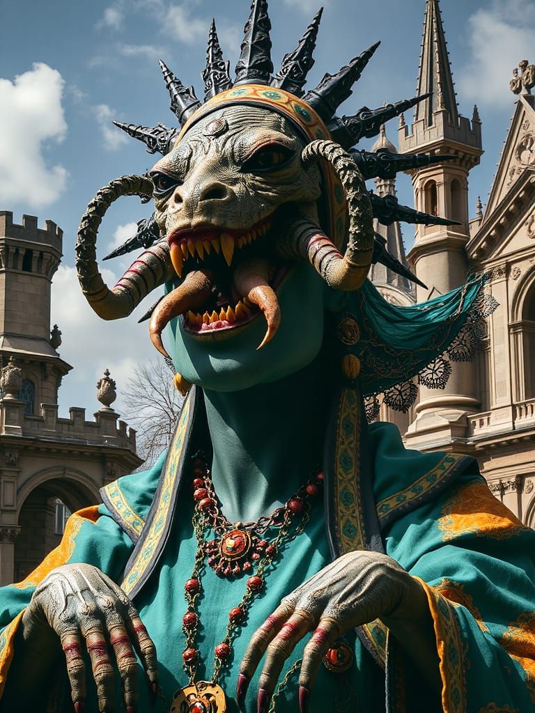 A striking picture of a Gothic queen with exaggerated teeth and claws, adorned in turquoise and orange robes. The artwork blends African art with a neoplasticism aesthetic, set against a medieval backdrop.