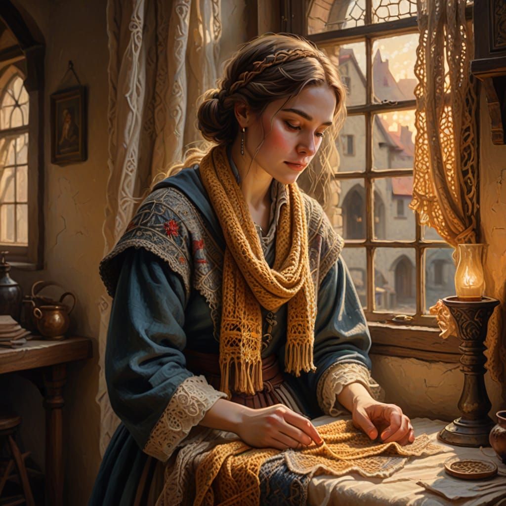 This oil painting captures a beautiful woman in medieval dress, crocheting a scarf by a window. The scene features golden hour light, soft pastels, and a cozy, romantic atmosphere with intricate details and a vintage feel.