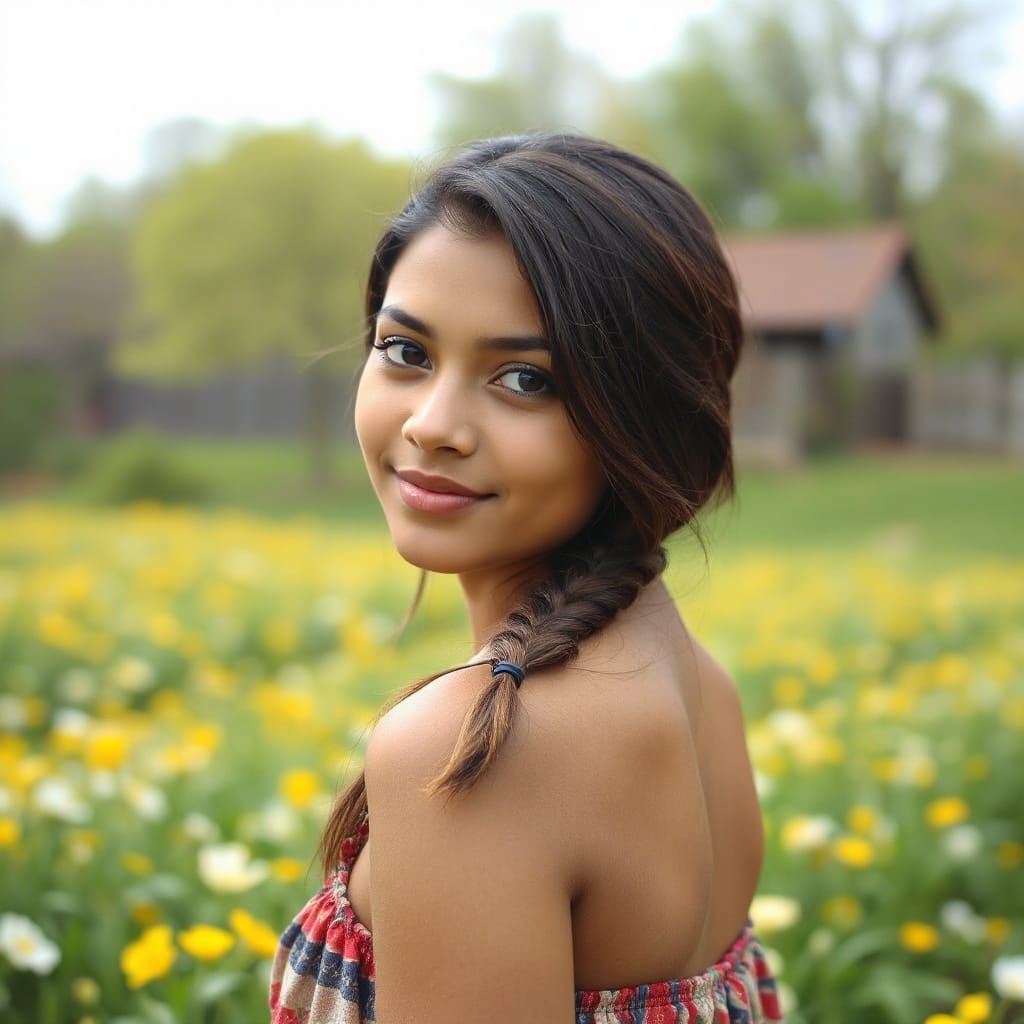 A striking picture of a beautiful young Indian woman facing the camera. She has braided hair and is standing in a field of spring flowers.