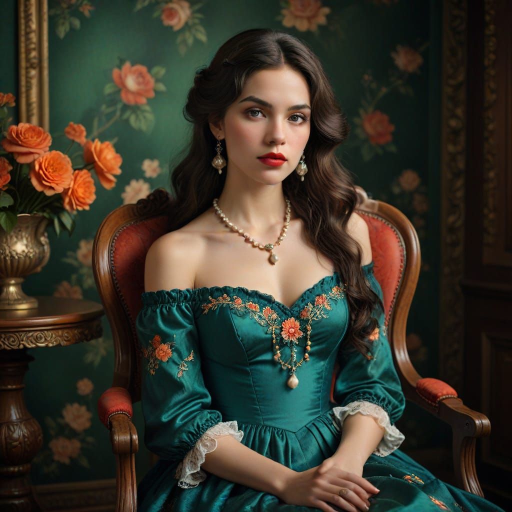 A captivating portrait of a woman in vintage attire. The subject has long, dark wavy hair and is wearing a blue floral dress, pearl necklace, and dramatic makeup, reminiscent of 19th-century fine art photography.