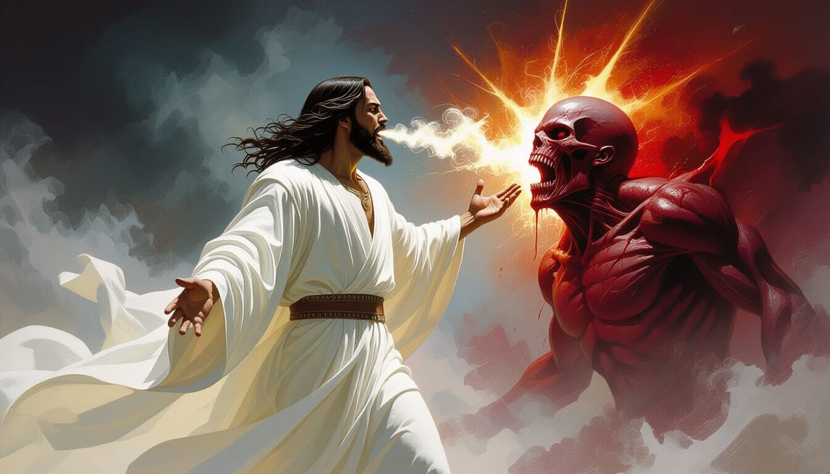 This image depicts a heroic Jesus Christ in white robes defeating the Antichrist with his breath, set against an apocalyptic background. The artwork evokes the style of epic fantasy art.