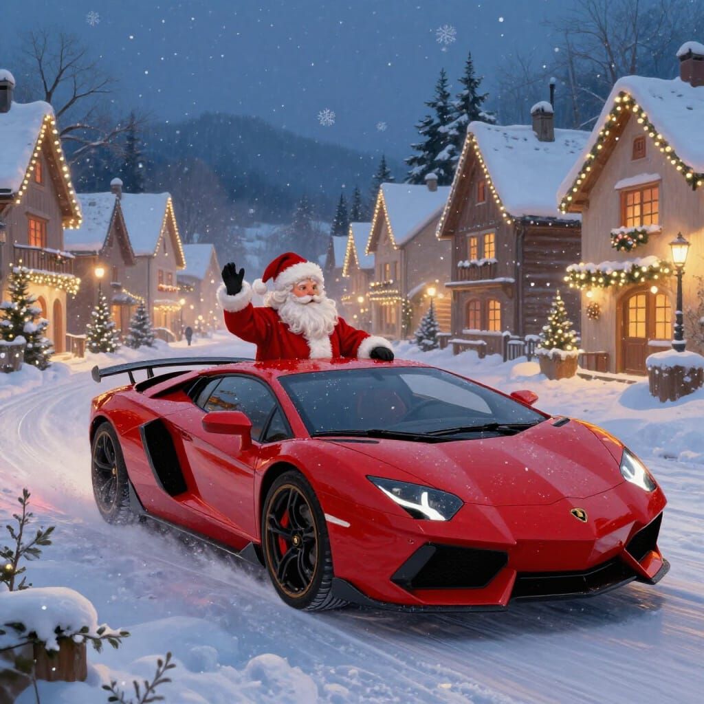 This image shows Santa Claus driving a red Lamborghini through a snowy European village at twilight. Features twinkling lights and a hyperrealistic digital painting style with a magical sparkle.