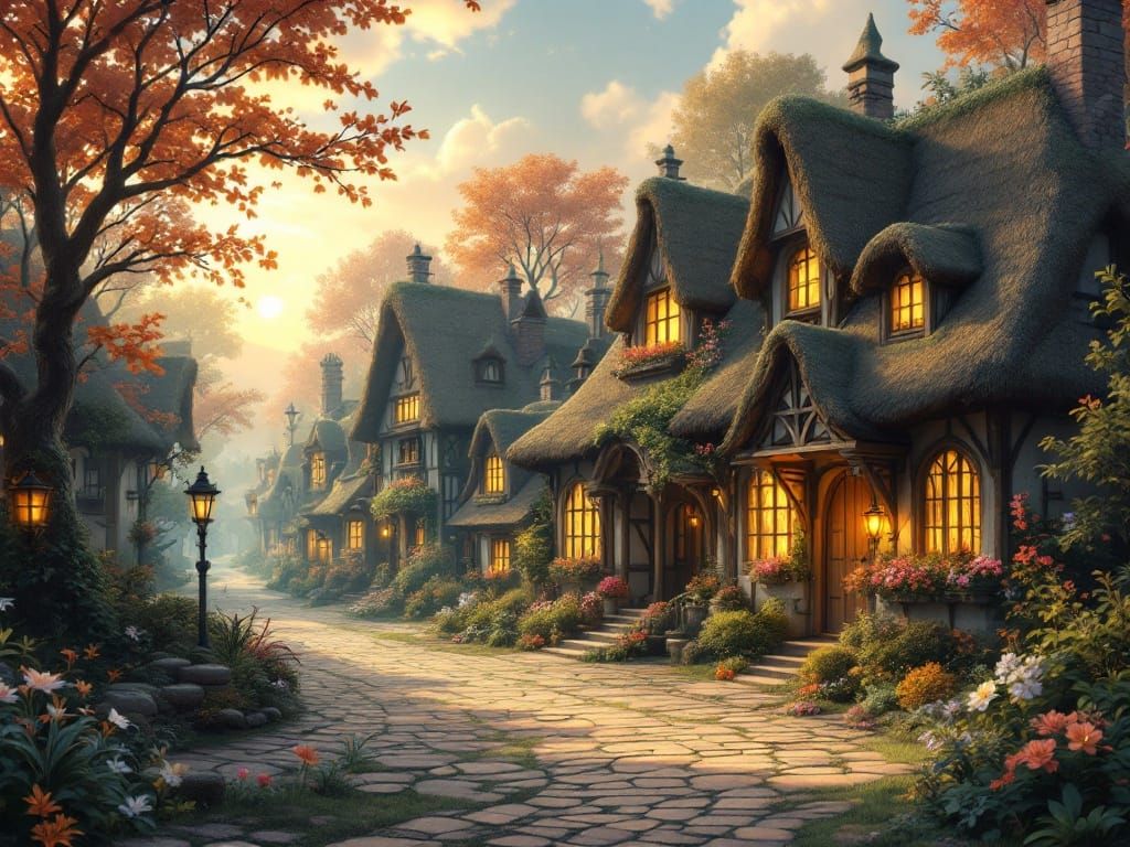 This enchanting scene shows a fairytale street corner filled with medieval fairy houses, surrounded by lush greenery and bathed in the warm, golden light of the magic hour, with intricate details and a vibrant color palette.