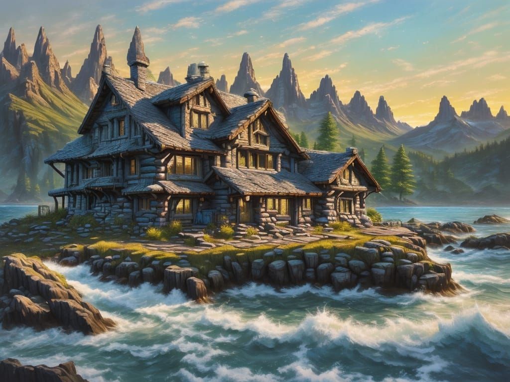 A highly detailed painting of a cozy wooden cabin nestled between green mountains and a blue sea. Features rough wood textures, sharp peaks, and warm light during golden hour.