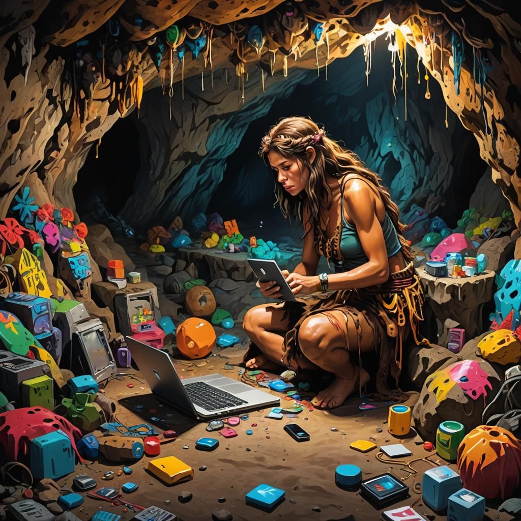 A hyperrealistic image of a cavewoman using the internet. The artwork features a vibrant graffiti art style with melting oil gouache textures and high contrast, polychromatic colors.