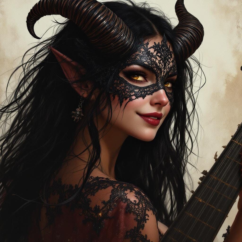 This image shows a red-skinned Tiefling woman with golden eyes, dark hair, and horns. She is smiling, playing a lute, and wearing a black lace masquerade mask in a fantasy D&D aesthetic.
