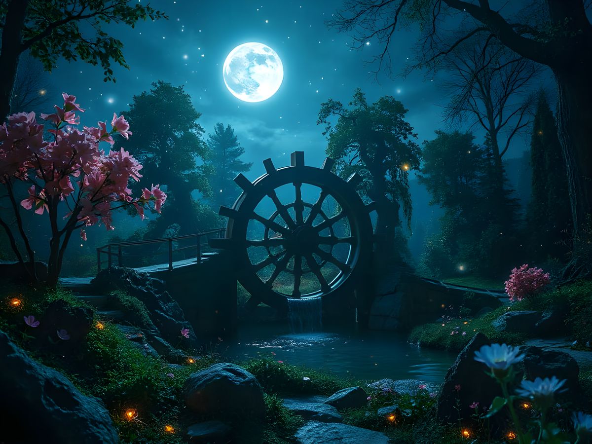 This image shows a breathtaking digital painting of a majestic waterwheel under the full moon, surrounded by magical trees, shimmering fairy dust, and bioluminescent flowers, with intricate details and whimsical designs, creating an epic and cinematic atmosphere.
