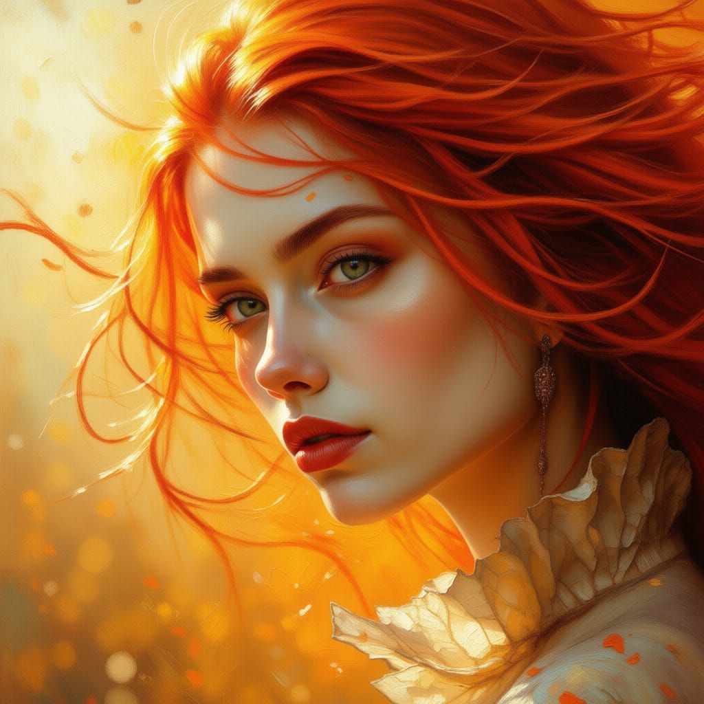 This image shows a woman with flowing red hair, rendered in a textured oil painting style. Golden hour light creates a warm, glowing effect on her face with visible brushstrokes.