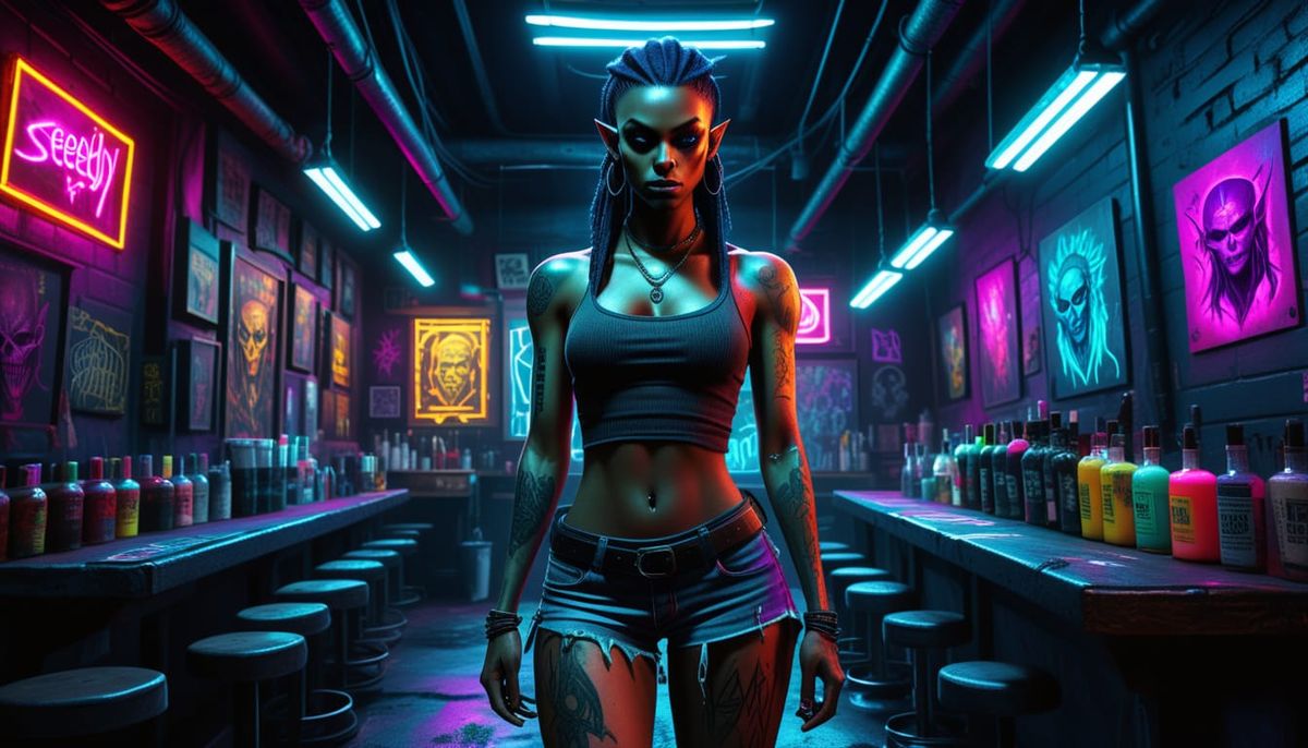 A Dark Elf in a seedy tattoo studio / bar on the bad side of town