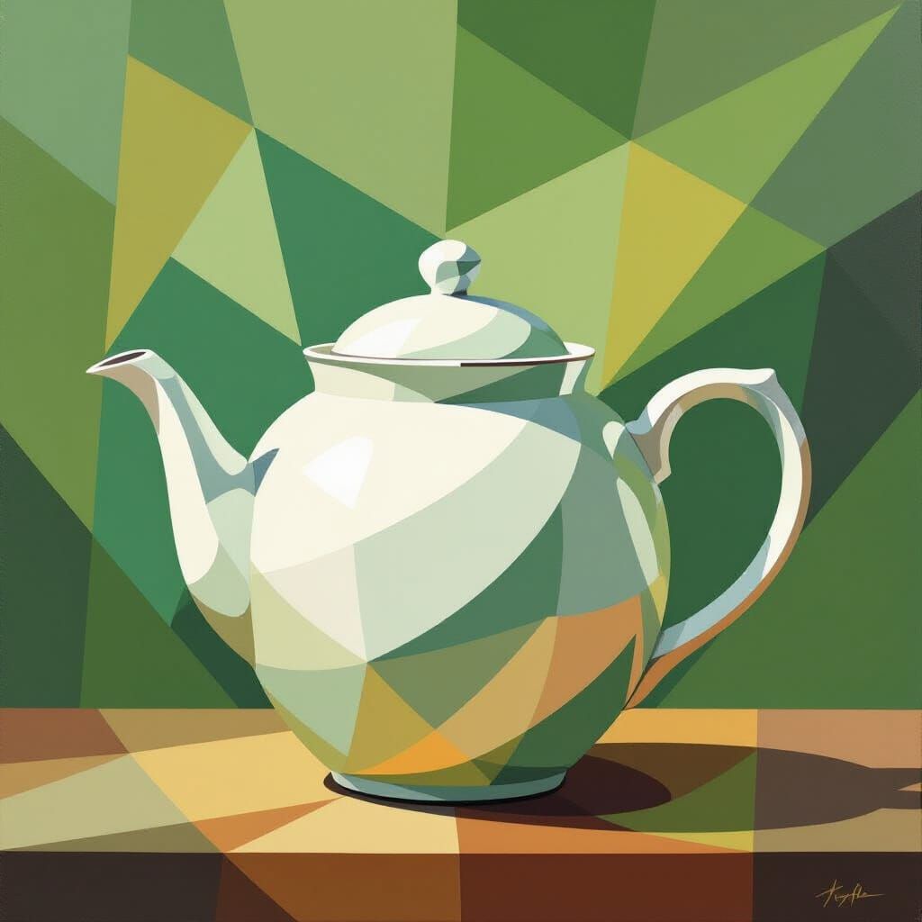This abstract cubist artwork depicts a friendly spirit of green tea, formed from sharp geometric shapes, pouring from a large white teapot in vibrant greens and earthy tones.