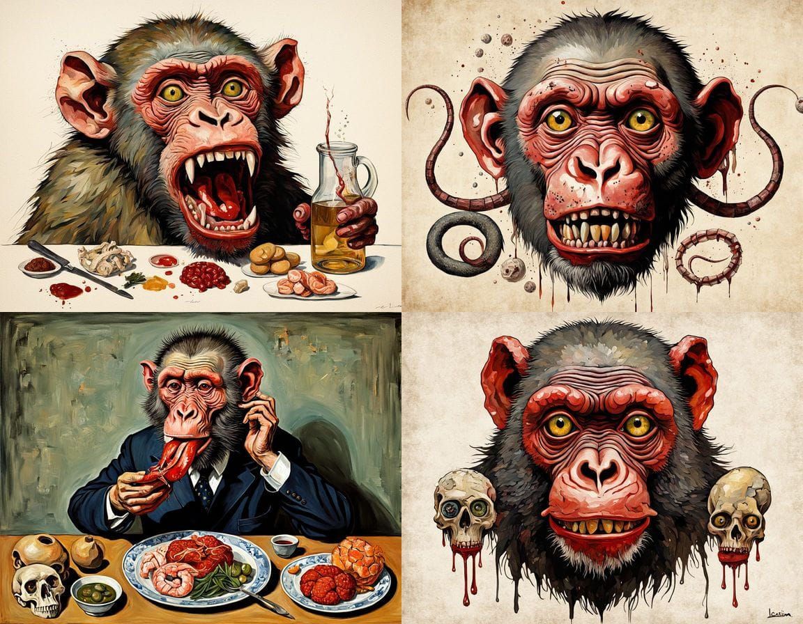 A bizarre surrealist image of a mythical baboon-like creature. The artwork evokes the styles of expressionist oil paintings, with grotesque anatomical elements and a disturbing, bloody aesthetic.