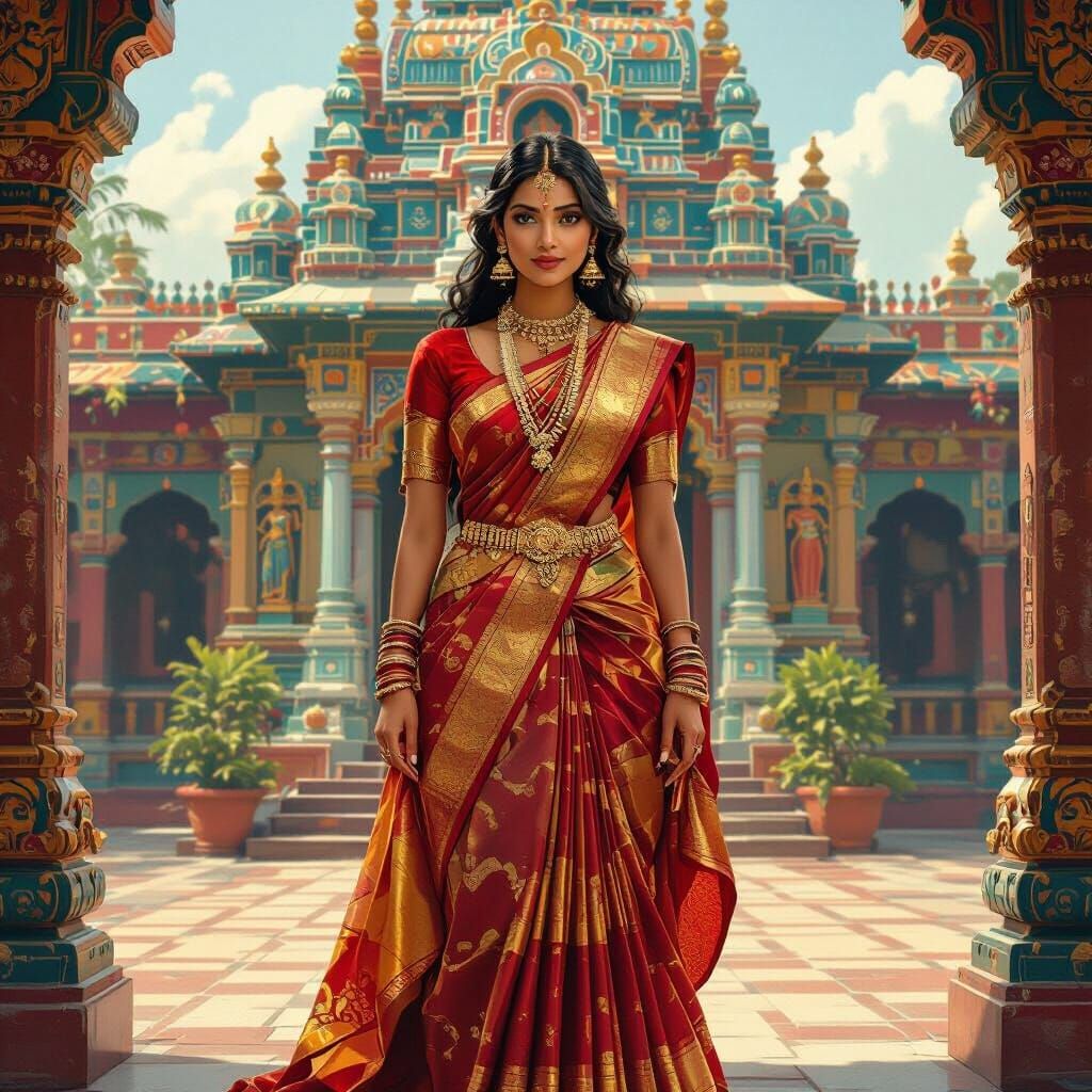 A captivating image of a woman in traditional Indian clothing posing before a Hindu temple. The artwork showcases intricate carvings and rich colors, with influence from classical Indian art.
