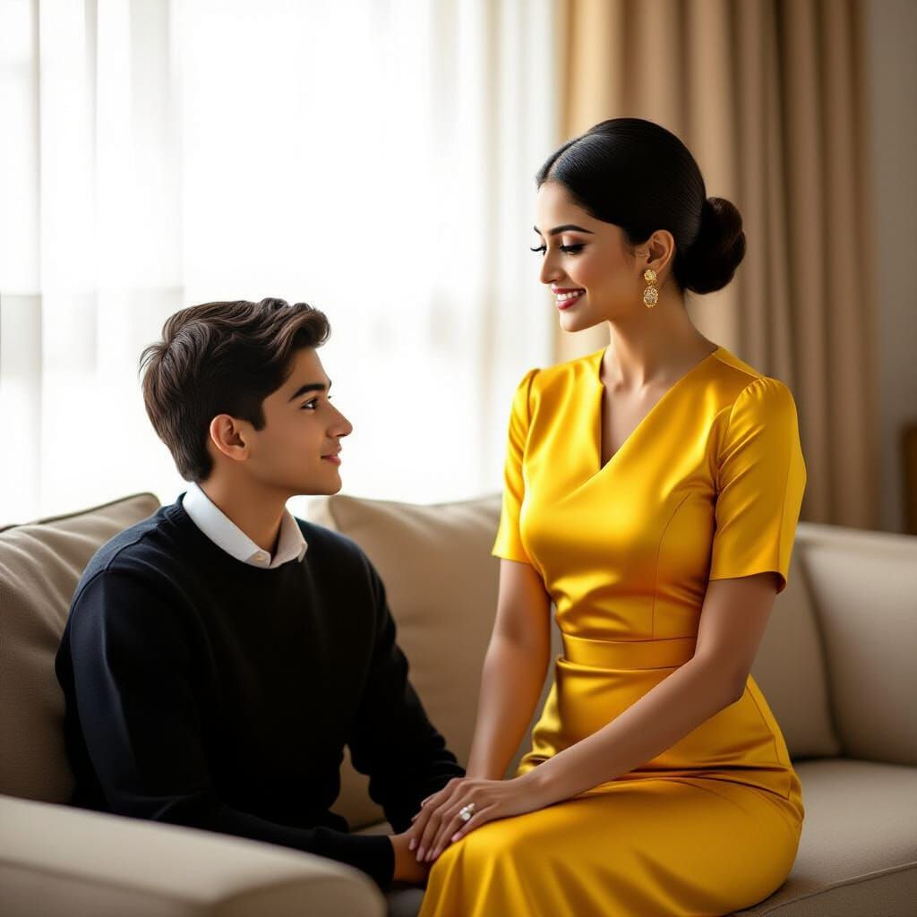 A photorealistic image of a beautiful Indian woman in a yellow top and pencil skirt, standing near a sofa. Soft ambient lighting creates a warm atmosphere, captured with cinematic composition.