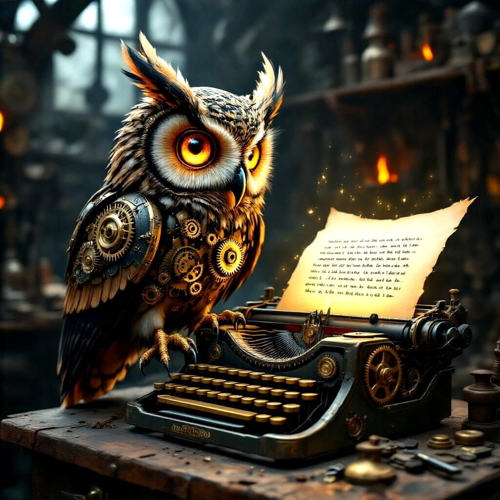 This image shows a majestic mechanical owl with glowing amber eyes perched on an old typewriter. The scene features intricate brass gears and a dimly lit blacksmith's workshop in a steampunk aesthetic.