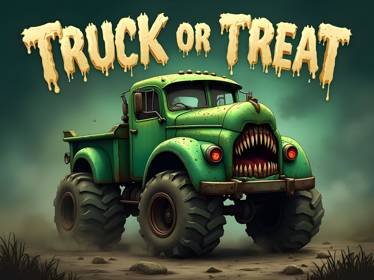 This image features a menacing green monster truck with a snarling face. The words "Truck or Treat" are displayed above in a creepy, oozing font.