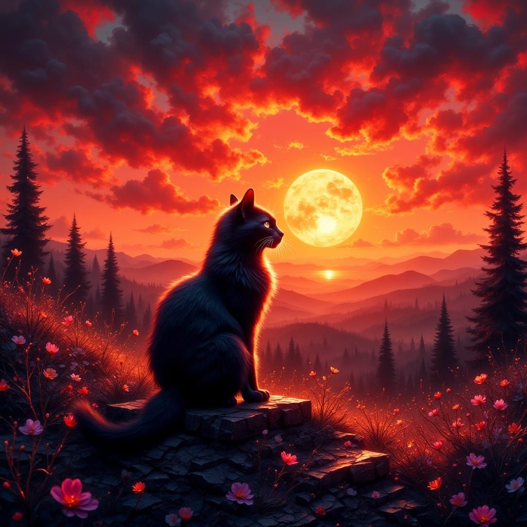 A striking picture of a black cat silhouetted against a vibrant sunrise. The image features vivid colors and a fairytale-like atmosphere with expressive textures, as impasto painting.