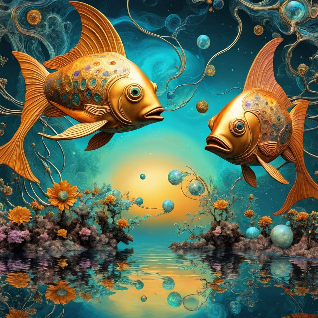 This vibrant sculpture showcases two fish in a swirling, mystical environment with cracked mirrors, glowing creatures, and intricate astrological designs. Inspired by the surrealism of Dali and the whimsy of handmade art, this 8k masterpiece is a mesmerizing blend of texture, dimensionality, and iridesce...
