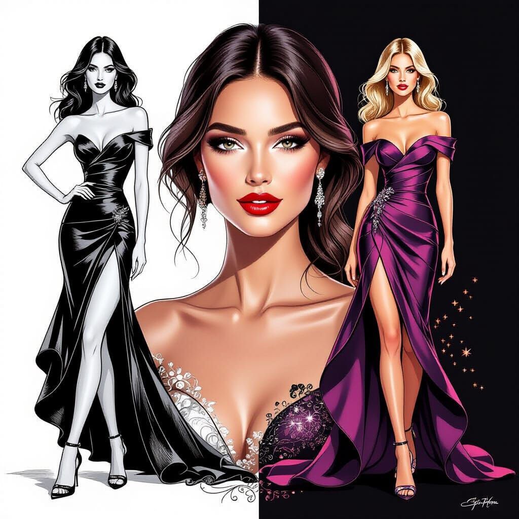 An elegant transformation portrait of a 30-year-old female model in a sophisticated cocktail dress and high heels. The left side shows her rendered in exquisite black and white fine line art - delicate pen strokes defining her facial features, flowing hair, the fabric texture of her dress, and elegant pose. Intricate cross-hatching creates shadows and depth, with precise linework capturing every detail from her expression to the shimmer of her dress fabric and the sleek curves of her stiletto heels. The center shows a mesmerizing transition where the black ink lines gradually bloom with color - skin tones emerge warmly, hair gains rich brunette or blonde hues, the cocktail dress fills with deep jewel tones or metallic shimmer, and lips become ruby red. The right side presents her as a highly detailed color illustration with full saturation